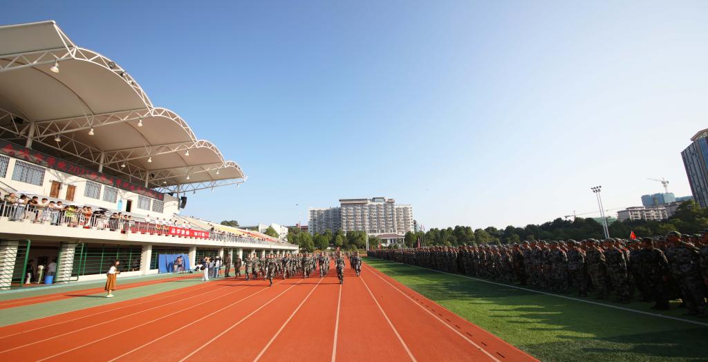 检阅开始,教官和来自各连的优秀学员进行了应急棍、格斗基本功、战术表演、擒敌拳等11个项目的表演,擒敌拳和匕首操英姿飒爽;刺杀操和军体拳刚劲有力;战术表演引人注目,充分展示了我校2021级学子斗骄阳、战酷暑的军训成果和坚毅进取、团结友爱的精神。随后,分列式表演正式开始,教官方阵和40个新生方阵军容严整、士气高昂,他们依次经过主席台,接受学校领导和在场师生的检阅,他们的动作整齐划一、口号响彻云霄。