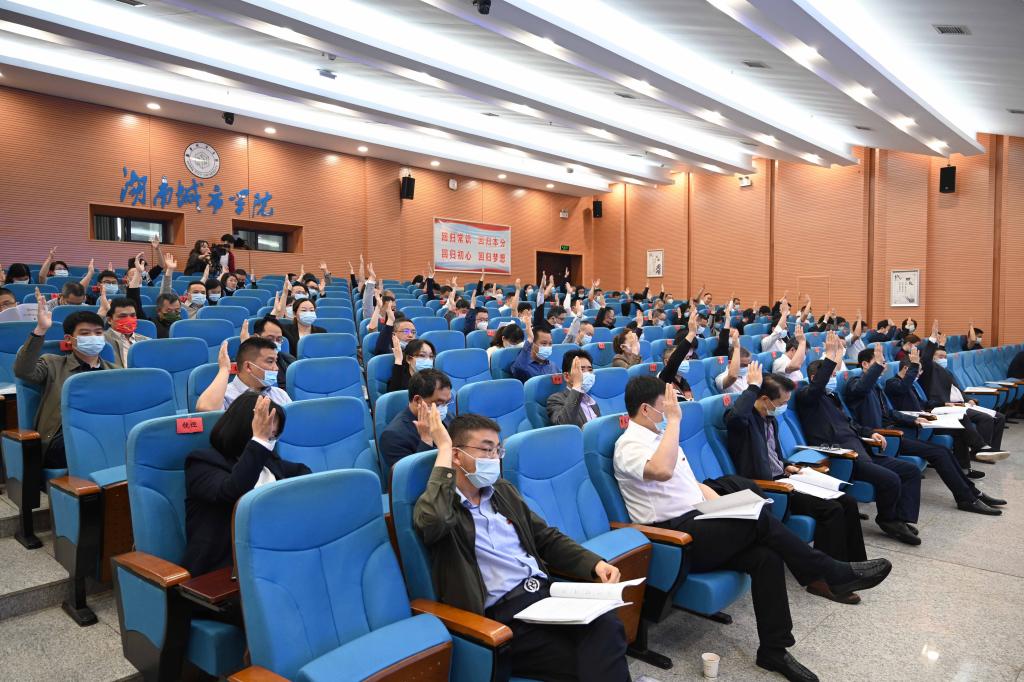 报告首先回顾了学校2021年工作。报告指出,2021年,学校党委行政班子深入学习贯彻习近平新时代中国特色社会主义思想,不断增强“四个意识”,坚定“四个自信”,捍卫“两个确立”,做到“两个维护”,团结带领全校师生员工继往开来、接续奋斗,成功召开第四次党代会,圆满完成党委领导班子换届工作,科学谋划了“十四五”发展蓝图,以党的建设为统领,以高素质应用型人才培养为中心,主动对接“三高四新”战略定位和使命任务,深入推进“三全育人”综合改革,持续推进湖南省高水平应用特色学院和“双一流”建设,成功获批硕士学位授予单位,各项事业取得了新发展。