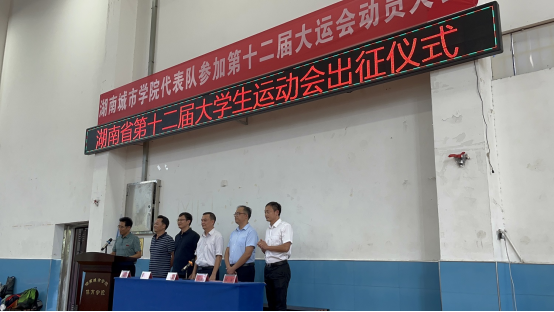 本网讯(通讯员 郭羽)2022年9月13日下午,我校代表团参加湖南省第十二届大学生运动会出征仪式在体育训练馆篮球馆举行。副校长雷存喜出席出征仪式并为我校体育代表团授旗。教务处相关负责人及体育学院班子成员、教练员、运动员130多人参加出征仪式。
