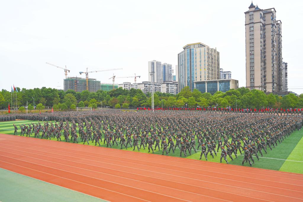 军训成果汇报表演由副校长雷存喜主持。军训教官表演了摔擒格斗、分队战术行动演练、擒敌拳、匕首操、应急棍,各学院新生表演了《团体操》《军体拳》《旗操、手语操》等节目。其后,在教官方队的引领下,各二级学院新生方队喊着嘹亮的口号,迈着铿锵有力的步伐,昂首阔步、意气风发地经过主席台接受检阅,向全校师生展示了2022级新生14天的军训成果和蓬勃朝气。