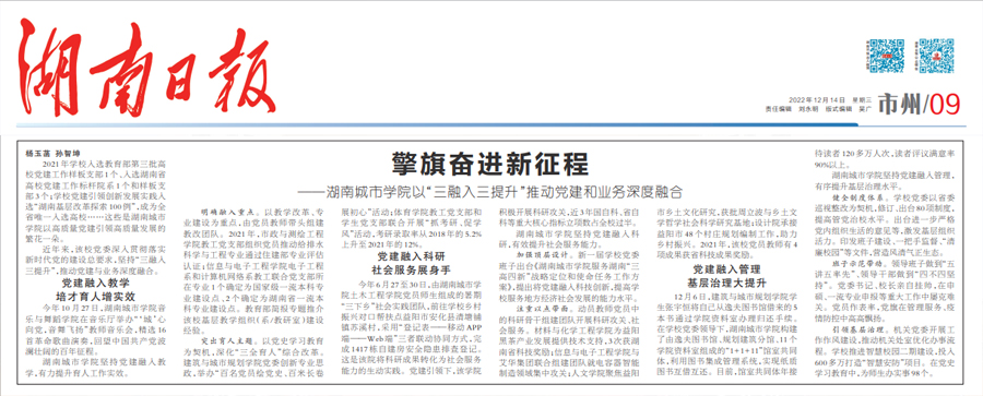 本网讯 12月14日,《湖南日报》09版以《擎旗奋进新征程——易游在线平台以“三融入三提升”推动党建和业务深度融合》为题,报道了我校党建引领学校改革发展取得的新成效。全文如下: